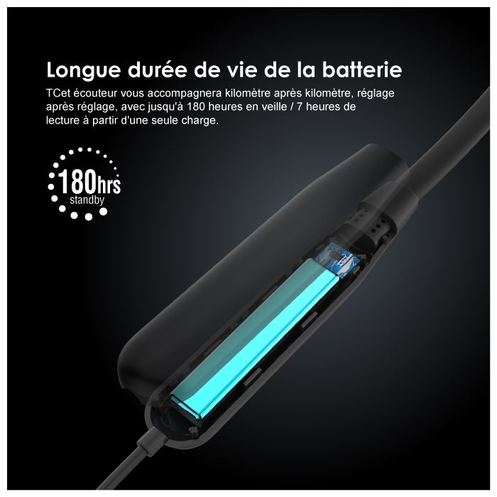 Built-in 100mAh battery provides up to 7 hours of talk time, 7 hours of music time and 180 hours of standby