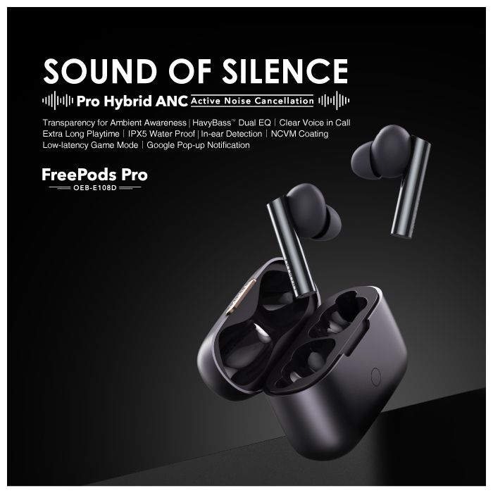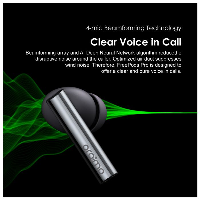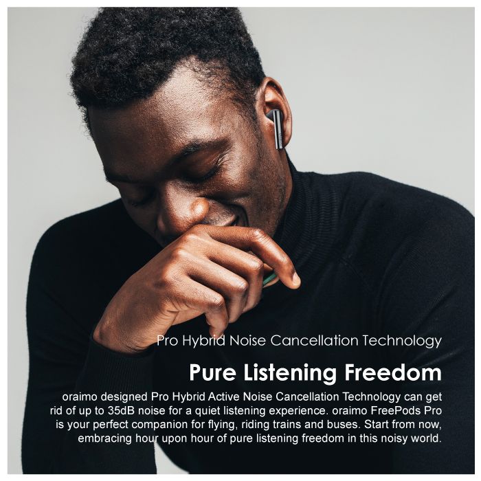 The oraimo FreePods Pro are engineered to eliminate up to 35dB of noise for a quiet listening experience. The oraimo FreePods Pro is the perfect companion for the plane, train or bus. Start now, embracing hours and hours of pure listening freedom in this noisy world.